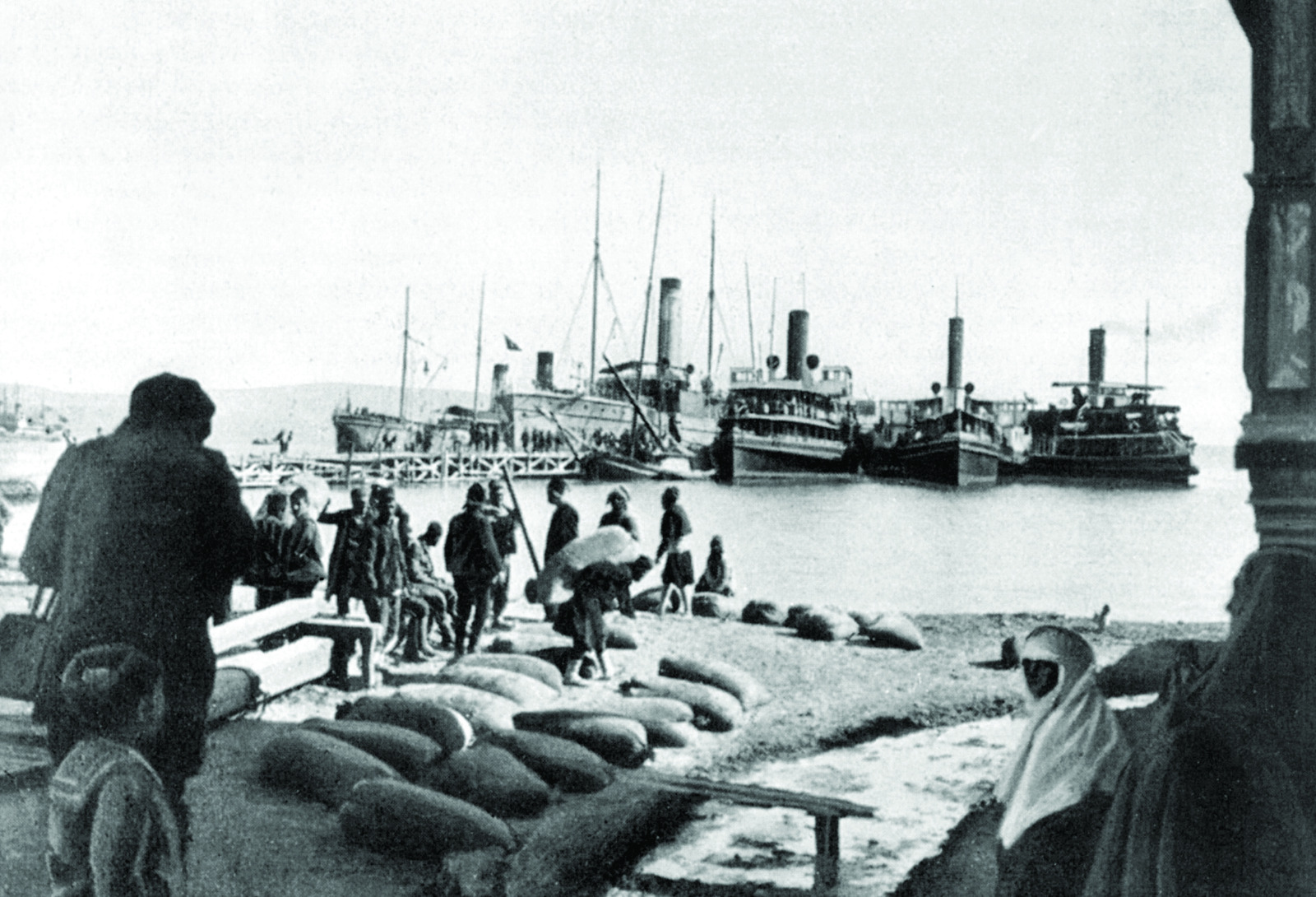 Gelibolu Muharebeleri'nde yararlıklar gösteren Şirket-i Hayriye vapurlarının üçü Akbaş İskelesi'nde. Soldaki büyük vapur Plevne.